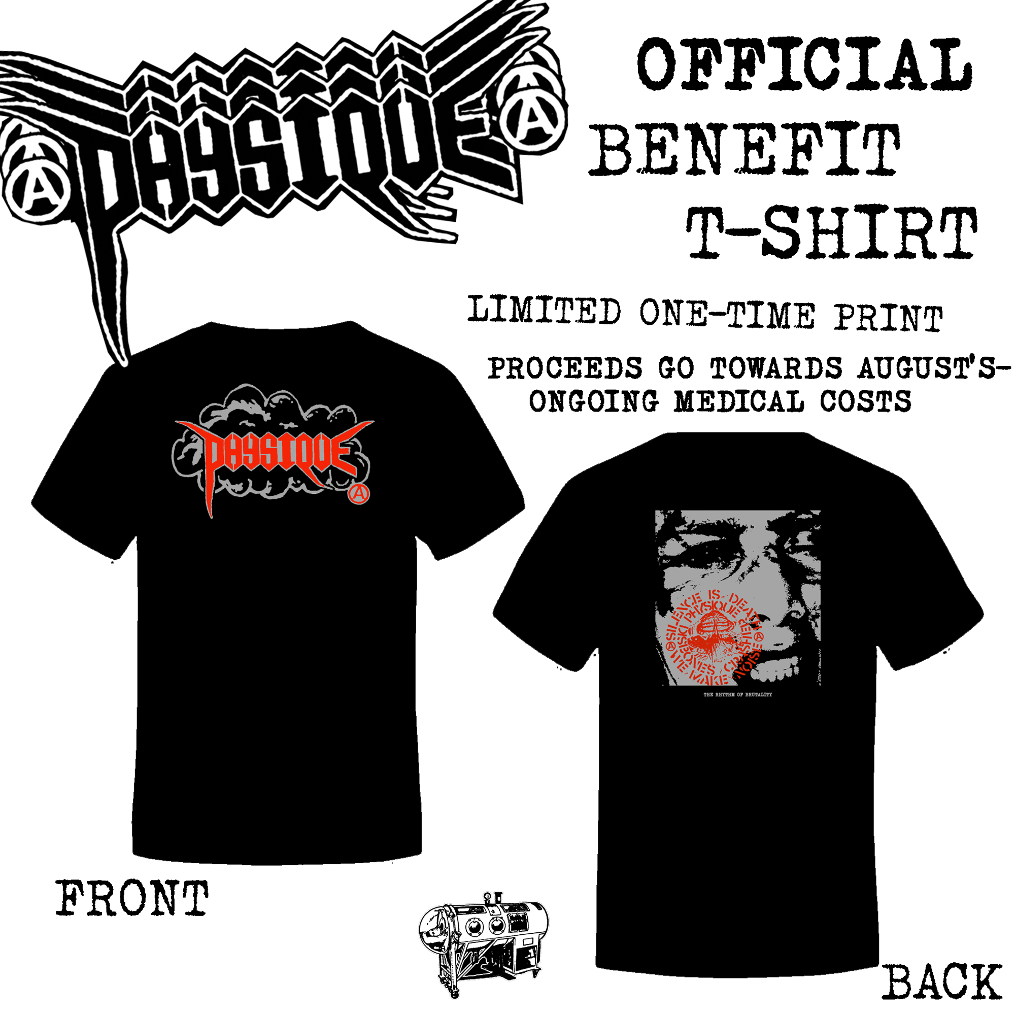 Our dear friend August, singer of PHYSIQUE, has had ongoing health problems and she's all out of money. To help with that, we have helped organize this special benefit tee shirt. An exclusive one-time design. 2 color front and back prints on a black short sleeve tee. Printed by Joe B.